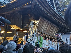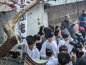 ほこらに餅などを供え、それを見物客らが奪い合う。てんぐの行列を見守る人々が