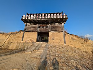 門の上部には古代の楯が並び、戦国時代や江戸時代の石垣や