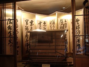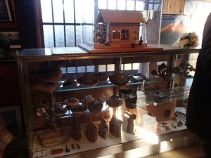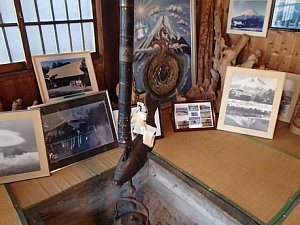 隠居屋は写真や木の置き物の展示が見える。