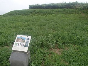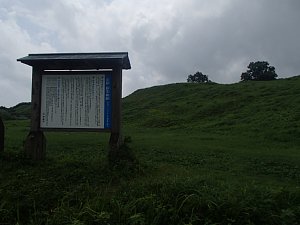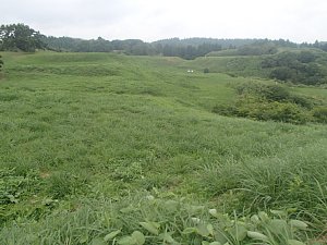 手前と奥の平地(曲輪)の間に段差がある。奥には日本海。
